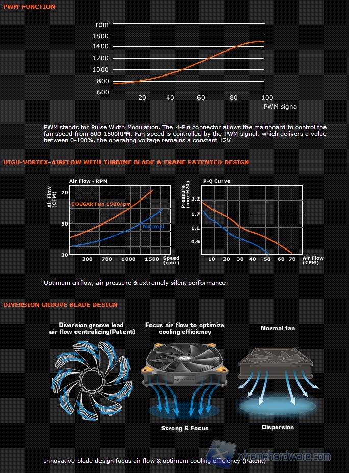 Cominciamo dall’analisi della Cougar. Ha un diametro di 140mm ed è un vero gioiello, se rapportata a modelli della concorrenza. Tra le caratteristiche tecniche spiccano dei motivi funzionali posteriori per l’incanalamento dell’aria verso il centro del cono di uscita, una tipologia del motore particolarmente elaborata, sia a livello fluidodinamico sia di MTBF, delle pale particolari e ondulate ed ovviamente la gestione PWM. Presenta un MTBF sulla carta impressionante, addirittura 300.000h, un bearing avanzato e performance di prim’ordine, gli permettono di eccellere. Di seguito alcune caratteristiche tecniche: