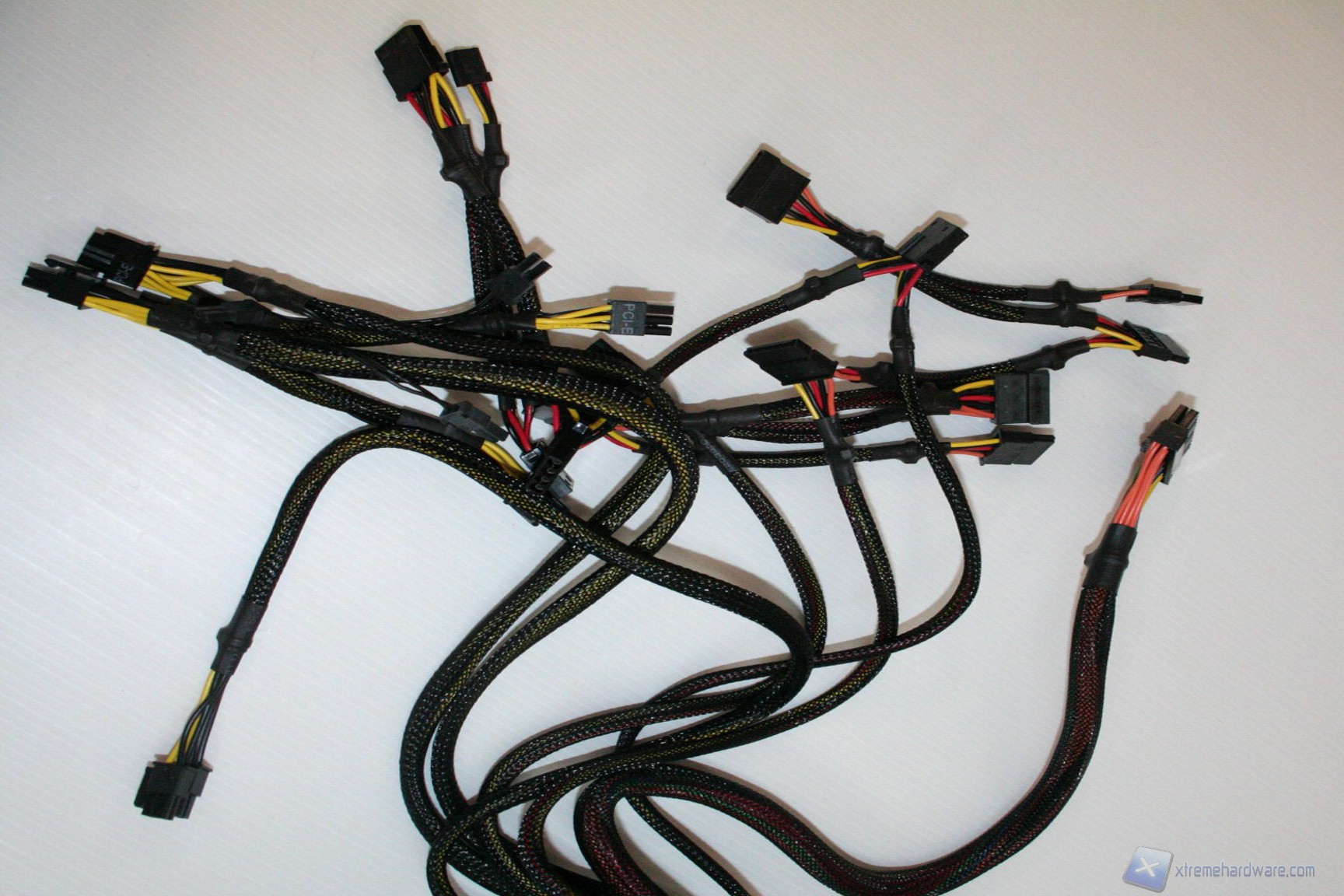 La lunghezza dei cavi è buona in quanto siamo nell’ordine dei 52cm per il connettore da 20+4PIN. Consigliamo sempre di acquistare prolunghe, soprattutto per la 24 PIN ed il connettore di alimentazione da 8 PIN della scheda madre, però in questo caso non sono necessarie, a meno che non si utilizzi un cabinet molto grande. Data la presenza di due connettori da 6+2 Pin, 4 connettori Molex ed 8 connettori di alimentazione SATA, sarà possibile alimentare un sistema dall’elevata potenza, anche se purtroppo però un utilizzo a doppia scheda video è limitato a due modelli aventi cadauno un solo connettore di alimentazione da 8 PIN. L’alimentatore non è modulare e lo sleeving risulta essere di buona qualità; la tipologia dei connettori è standard.