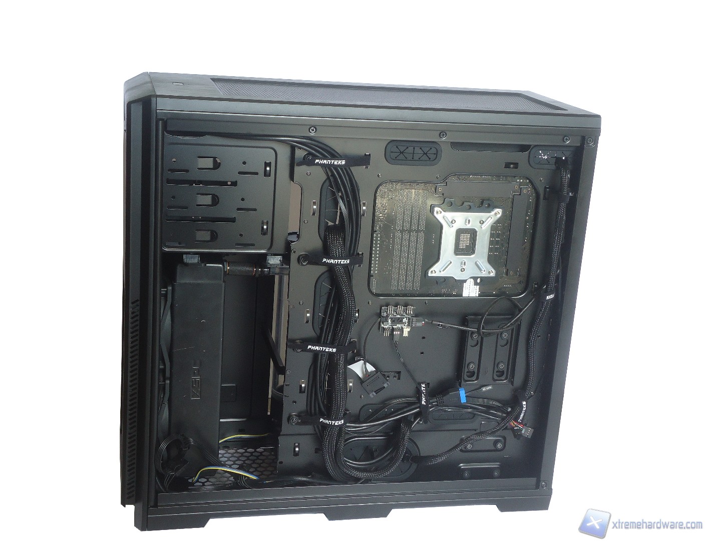 E’ quindi possibile integrare un radiatore da 60mm (nel nostro caso un XSPC RX 360) ma senza ventole (lasciandolo quindi fanless), oppure un radiatore slim da 30 o 40mm con una serie di ventole in push o in pull. Sarebbe stato perfetto poter installare un radiatore da 45mm più una serie di ventole, ma lo spessore complessivo sarebbe di 70mm e andrebbe ad ostacolare sia la connessione 8pin che probabilmente gli slot RAM. Questo è un neo, sicuramente, ma date le dimensioni del case non si può pretendere di poter integrare facilmente radiatori molto spessi. D’altra parte, probabilmente Phanteks avrebbe fatto bene ad aumentare di poco più di un centimetro l’altezza, estendendo la compatibilità dei radiatori installabili anche a quelli non slim. Tuttavia la possibilità di poter montare radiatori tri-ventola da 360 o 420 permette comunque di avere una sufficiente massa radiante per dissipare potenti configurazioni.