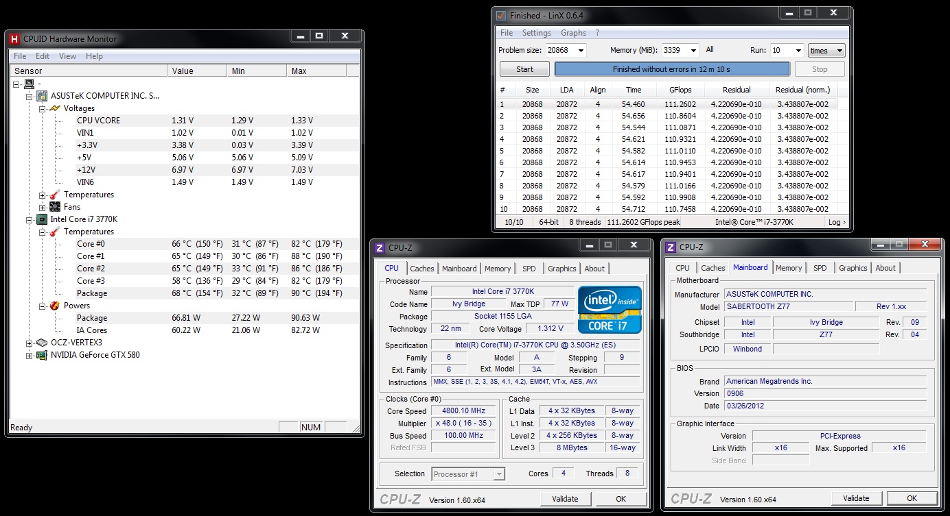 Vi proponiamo anche il Daily ottenuto alla frequenza di 4800 MHz. Come tipo di raffreddamento ci siamo avvalsi di un impianto a liquido modulare e professionale, composto di waterblock della EK modello Supreme HF Cu, radiatore da 360 e pompa con vaschetta. Soffermatevi sul valore GFlops di picco indicato nello screen, valore di tutto rispetto a questa frequenza, conseguenza dell’ottimo lavoro svolto sia da Intel con Ivy Bridge, che ne ha potenziato l’ALU, sia del robusto sistema di alimentazione della SABERTOOTH Z77 che ha richiesto un voltaggio non particolarmente elevato.