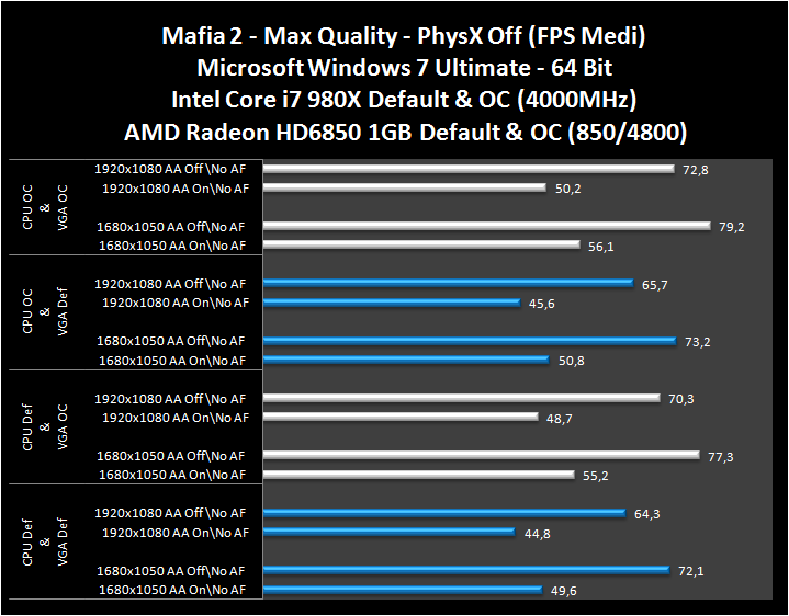 Nel grafico che segue, i risultati ottenuti con il Benchmark Tool del gioco. I test sono stati eseguiti alla massima qualità, alle due risoluzioni di riferimento con vari livelli di Antialiasing.